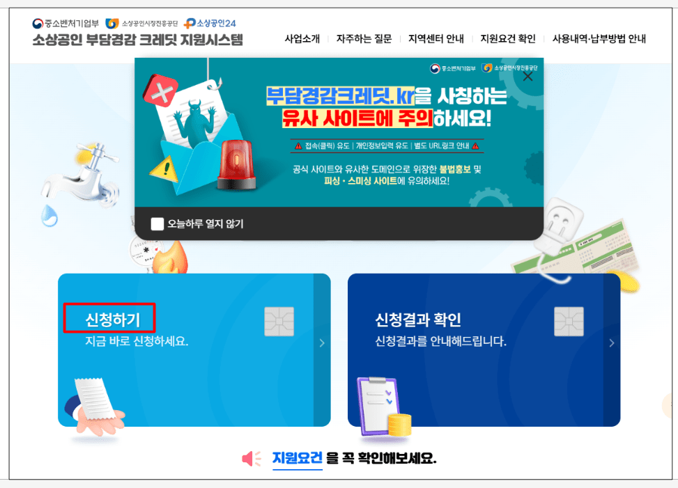 - [소상공인 부담경감 크레딧 지원시스템(credit.sbiz24.kr)] 또는 ‘소상공인 24’(소상공인시장진흥공단)에서 직접 접속.